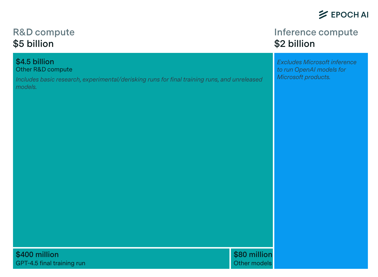 约 50 亿美元用于研发算力资源,其中 45 亿美元用于幕后研究和各种实验性运行;而仅有 4 亿美元用于 GPT-4.5 的最终训练;以及 8000 万美元用来训练其他模型; 约 20 亿美元用于面向客户的推理算力。机构人员分析表示,其根据对 OpenAI 从 2024 年第二季度到 2025 年第一季度发布的模型的计算和成本估计,OpenAI 在 2024 年的研发计算中,大部分可能分配给了研究、实验训练运行或未发布模型的训练运行,而不是发布模型如 GPT-4.5、GPT-4o 和 o3 的最终主要训练。